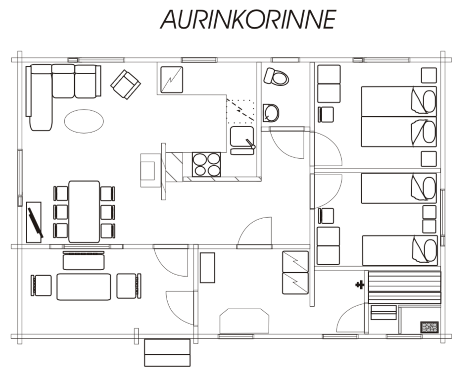 Log cabin 1994, living room/kitchen with sofabed, bedrooms with double bed, bedroom with 2 beds, washroom, dressing room, sauna (elec. sauna stove), open veranda. Lakeside sauna 10 sqm (heated by wood).