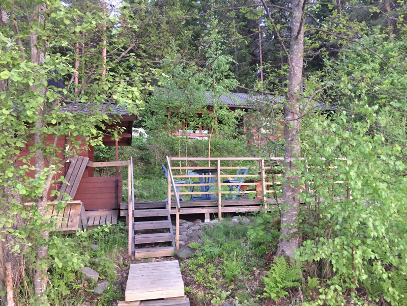 Mökkiin saapuva tie on aika jyrkkä. Mökki sijaitseekin suojaisen rinteen alalaidassa. Pihassa autolla ei kovin paljon tilaa, mutta kaksikin autoa mahtuu parkkiin. Etelään päin oleva rinne mökin takana varjostaa hieman päivällä aurinkoa. Ilta-aurinko näkyy kesällä erinomaisesti.