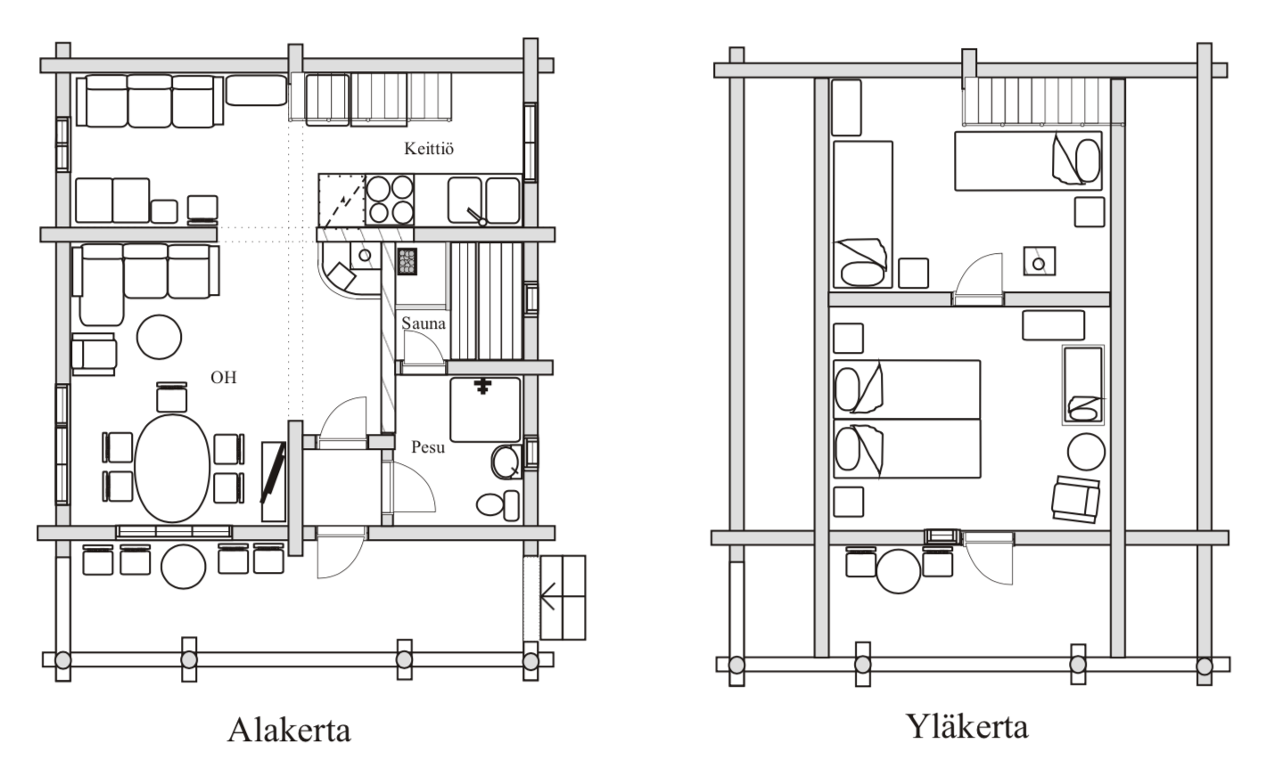 Log cabin 199, kitchen, living room with 1 extra bed (convertible sofa), washroom, sauna (electric sauna stove), open veranda. Upstairs: bedrooms with 2 beds, vestibul 2 beds, balcony (steep stairs to upstairs). Lakeside sauna.