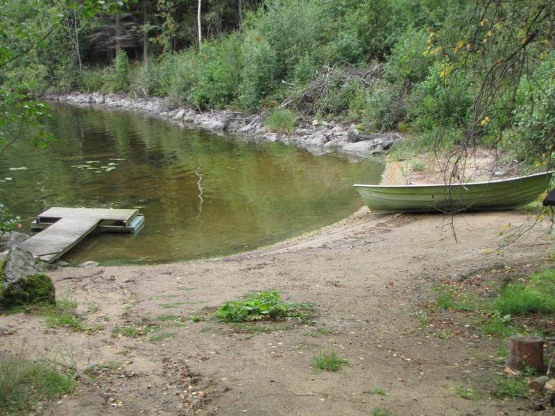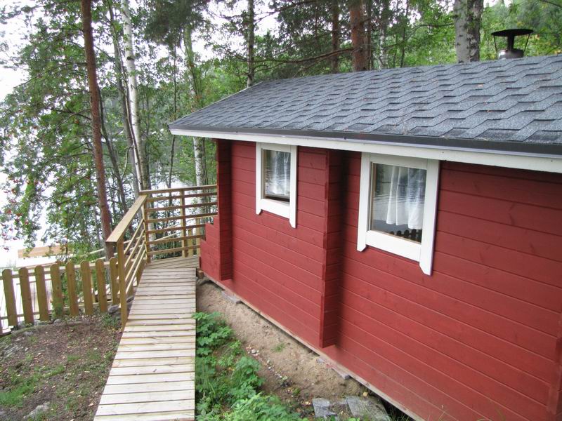 Mökin takanta 20metrin päässä mökin takaseinästä tie vierasvenelaiturille, tiellä lähinnä kävelyliikennettä. Pihasta ei näköyhteyttä tielle. Toisella puolella naapurina päärakennuksen yleinen hiekkaranta ja pieni sauna, ei vakituista käyttöä. Mökki soveltuu hyvin kahdelle henkilölle, olohuonee. Sohvan levittämällä kuitenkin saa kahdelle lisävuoteen.