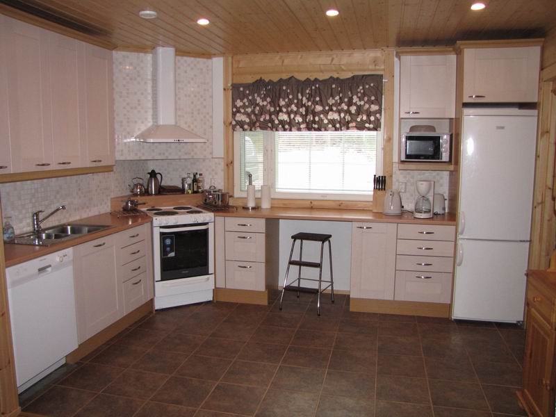Mikro, radionauhuri, kodinkoneita: (leivänpaahdin, kahvinkeitin ym.), TV, astian- ja pyykinpesukone, kuivausrumpu.