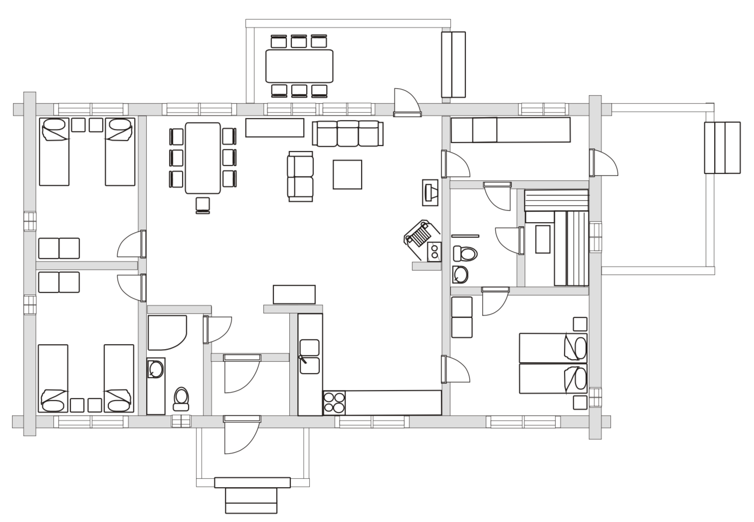 Log House 2011, a big kitchen, 3 bedrooms, each with two beds, shower room, dressing room, sauna (electric stove), two porches. Separate sauna with dressing room (sauna heated by wood).